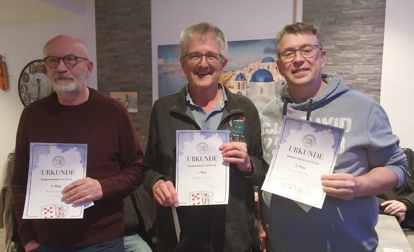Rudolf Leismann (3) – Hans-Peter Gompf (1) – Thomas Heinecke (2) Beim mit 52 Teilnehmern gut besuchten Turnier in Rutesheim bei Stuttgart konnte Hans-Peter Gompf seinen insgesamt 11. Turniersieg erringen, dicht verfolgt von Thomas Heinecke und dem vor Runde 3 führenden Rudolf Leismann. Rang Nachname Vorname Verein Punkte Platzziffer 1 Gompf Hans-Peter DA JA80 94 3,0 2 Heinecke Thomas HD SK95 90 6,0 3 Leismann Rudolf F GUDE 85 6,0 4 Dröge Jörg F GUDE 75 6,0 5 Helmchen Albert M DDUL 63 3,0 6 Ferfers Rolf F GUDE 53 5,0 7 Hans Stephan HH DKCB 51 7,0 8 Fotteler Raphael M WB 50 5,0 9 Kömpf Stefan DA JA80 46 4,5 10 Klein Burkhard MO K92 41 5,0
